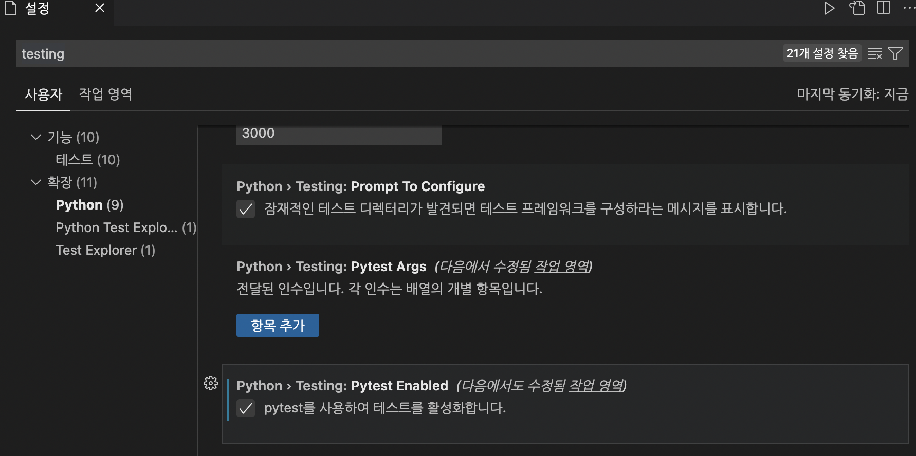 - vscode 설정에 들어가서 'testing'을 검색하여 python 목록에 들어간다.